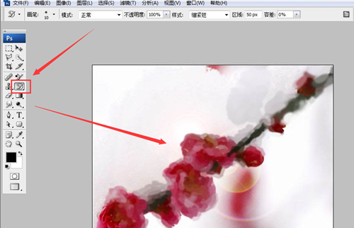 4、选择历史记录中的艺术画笔工具,将画笔大小设置为10,对梅花图片进行涂抹。